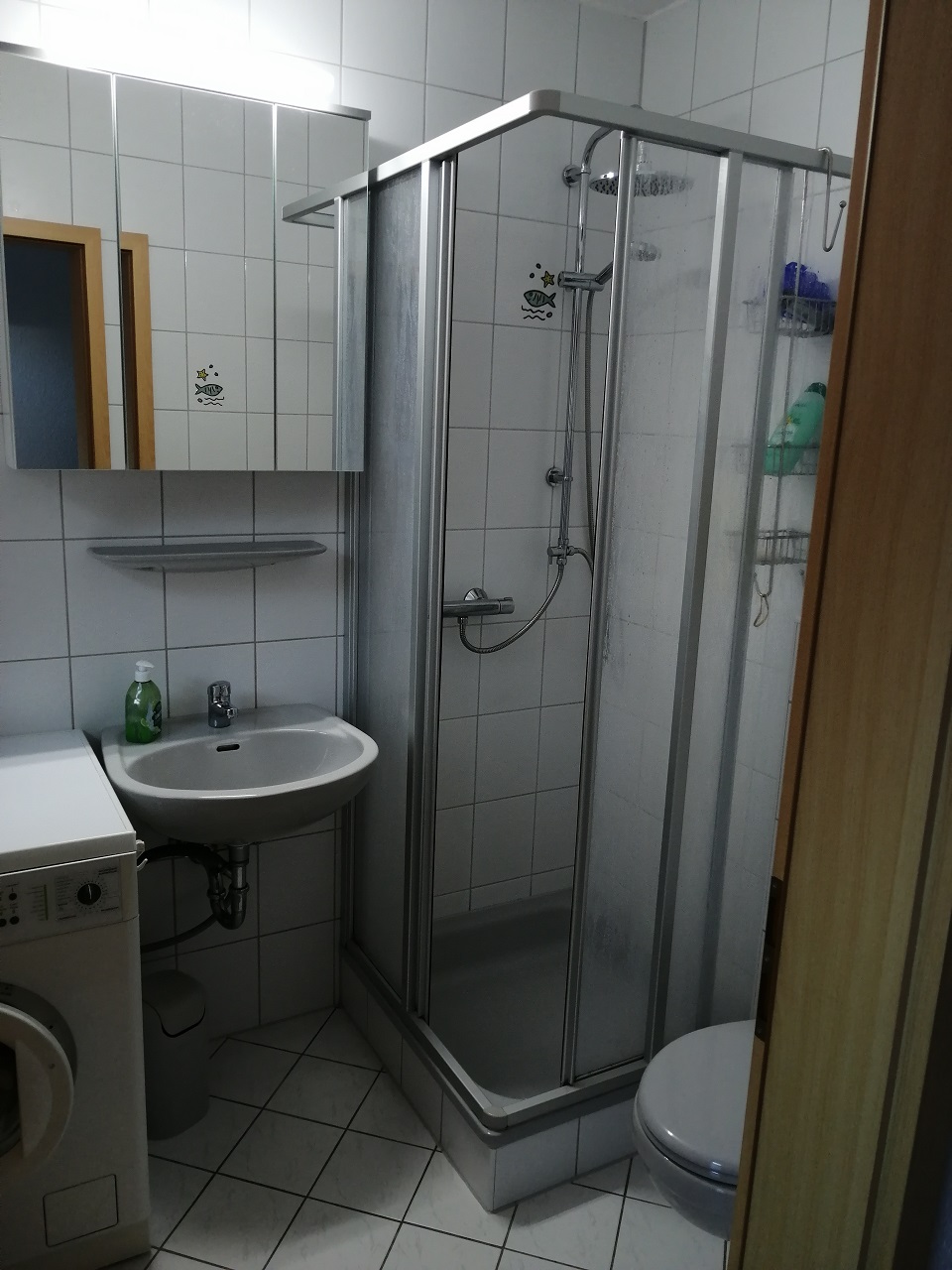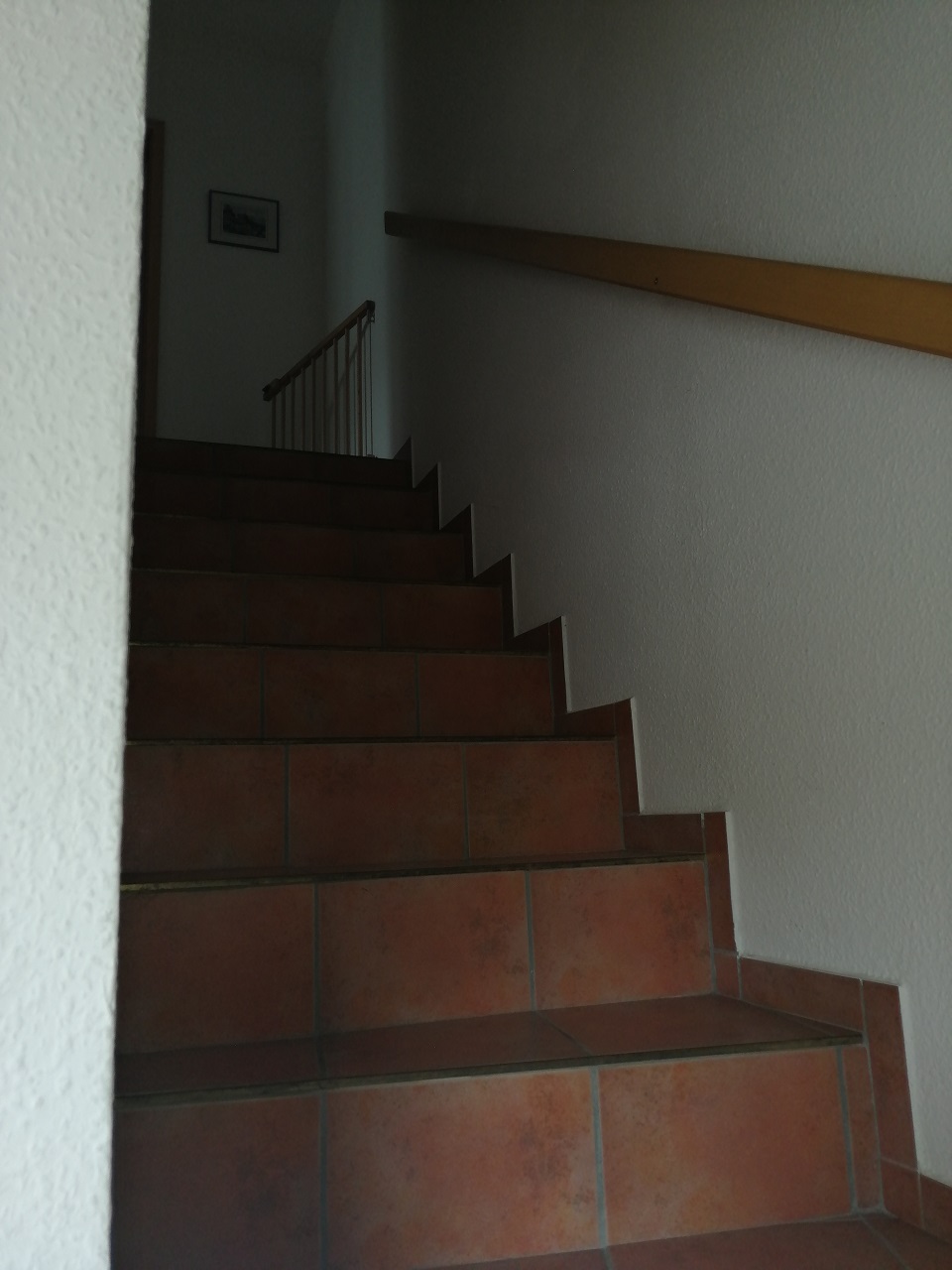 Von hier aus gelangen Sie auf die Treppe in das Obergeschoß, in einen Abstellraum, das Wohnzimmer und das Duschbad mit großem Spiegelschrank und Waschmaschine.