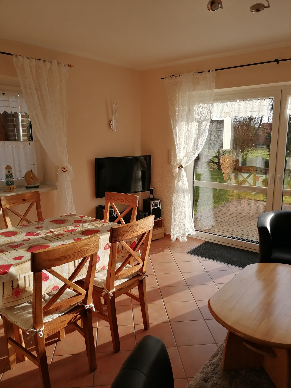 Das Wohnzimmer besteht aus einer gemütlichen Sitzecke, Flachbild-Fernseher mit Satelliten-Empfang, Radio und Essplatz für bis zu sechs Personen.