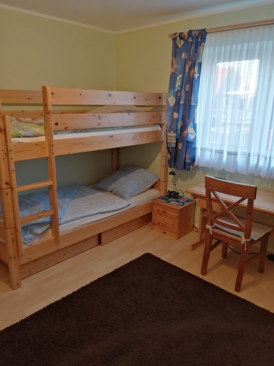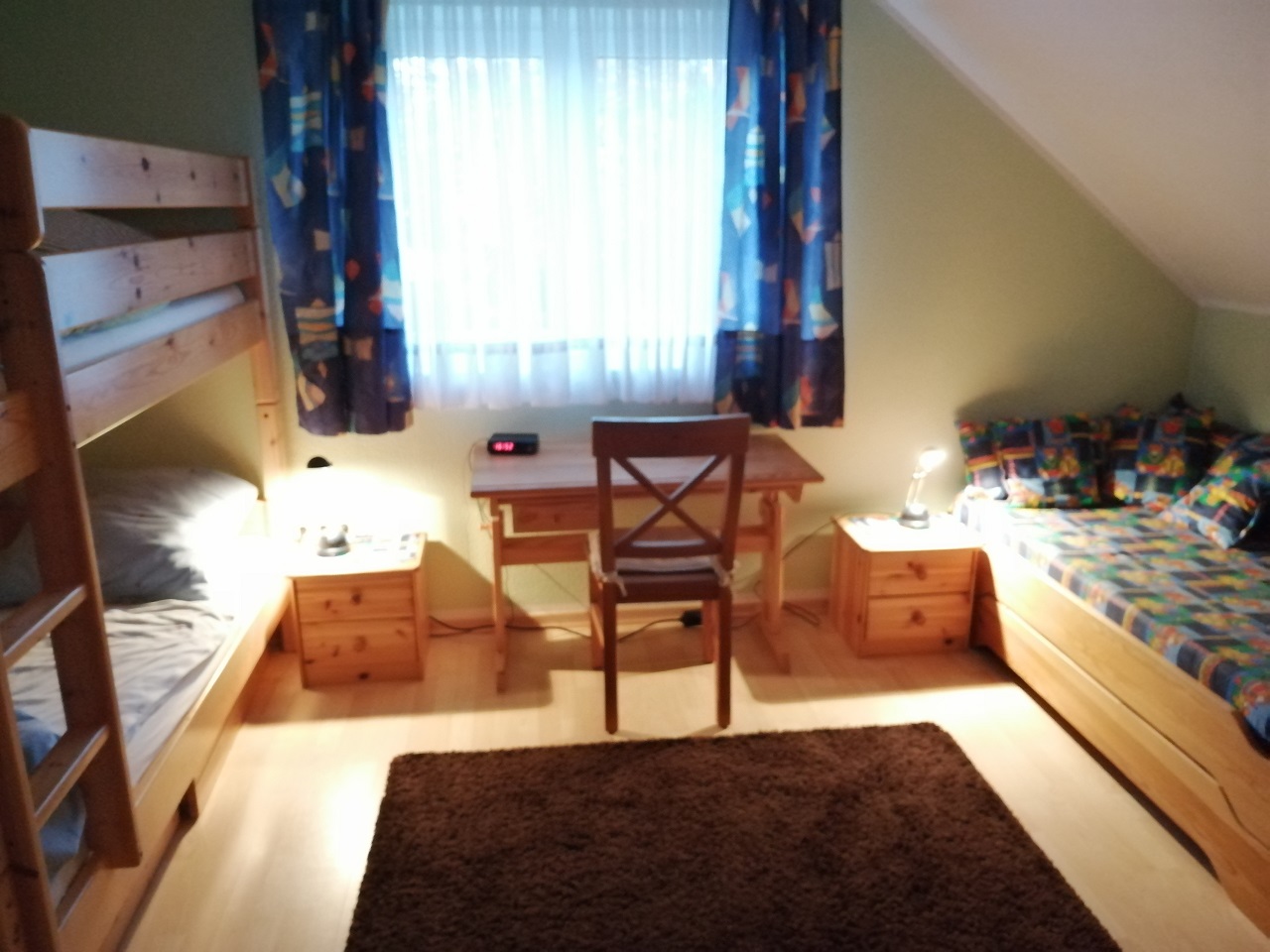 Von der Diele geht es auch in das Kinder-Schafzimmer mit einem Hochbett (2 Schlafplätze), einem einzelnen Bett sowie einem Kinderbett mit Wickelauflage.